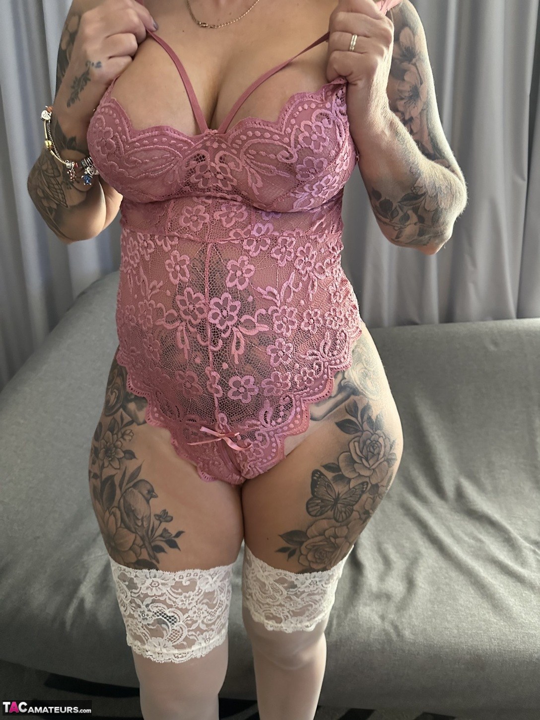 Inked Milf In Pink Set With Sexy White Stockings