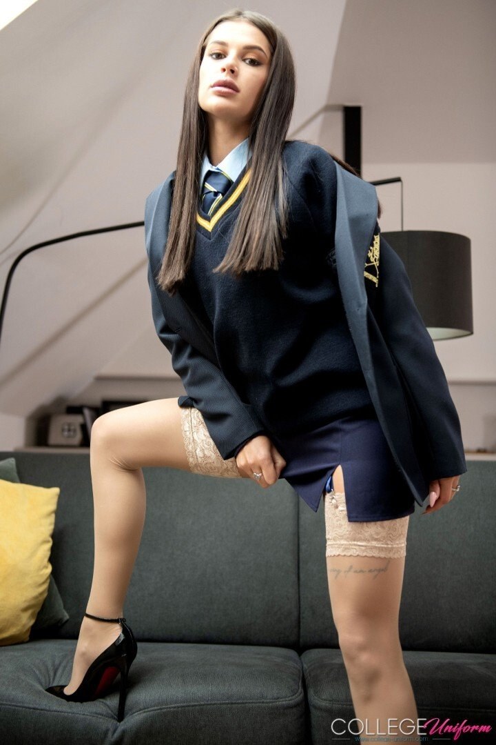 Beautiful Brunette Asandra Dewy In College Uniform And Stockings Gets Fucked On Couch