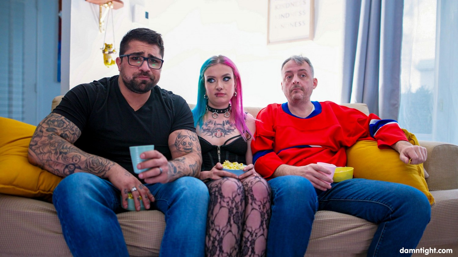 Pink Haired Luna Temptress In Black Patterned Stockings Has Threeway Sex With Alex Duca And Julian August