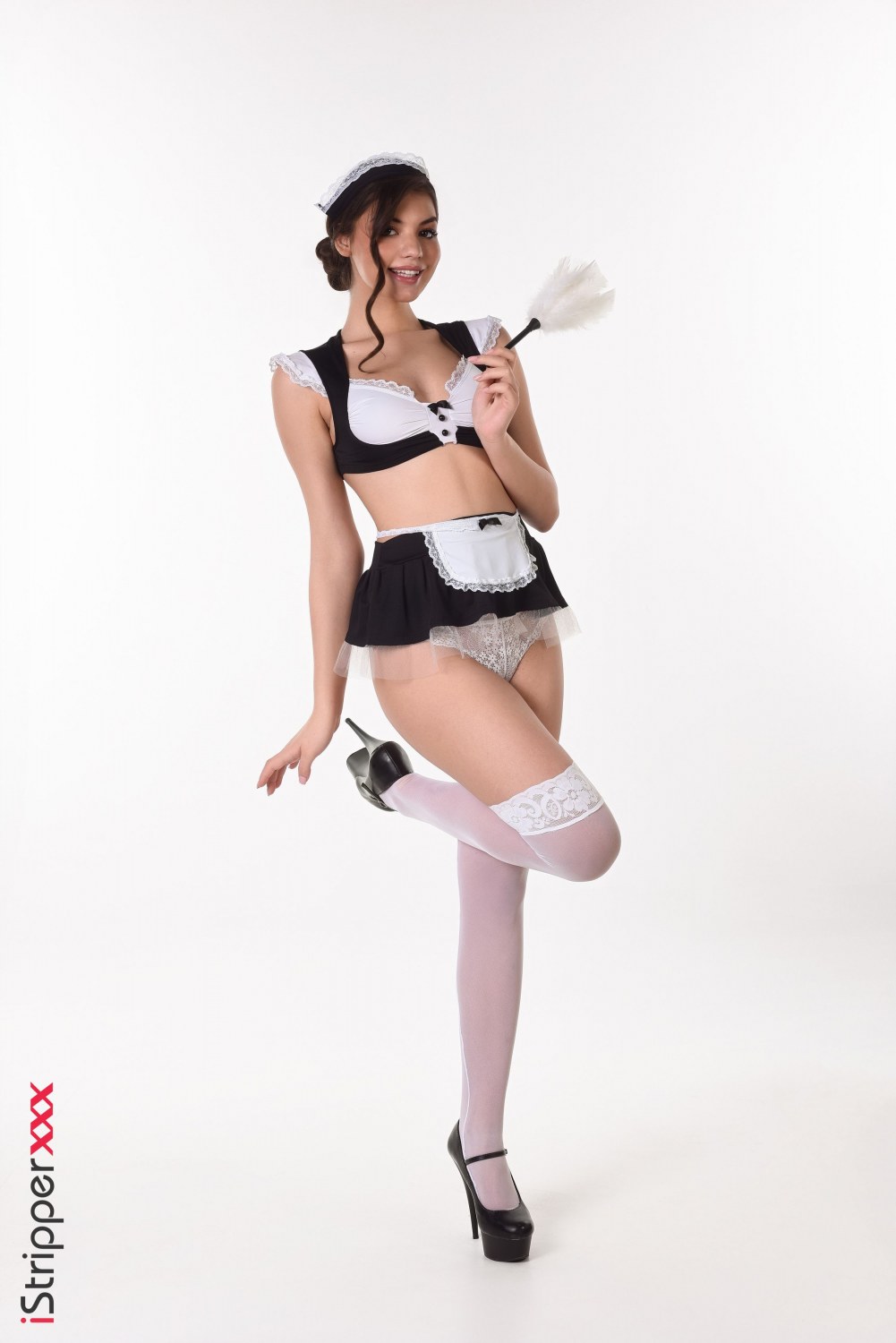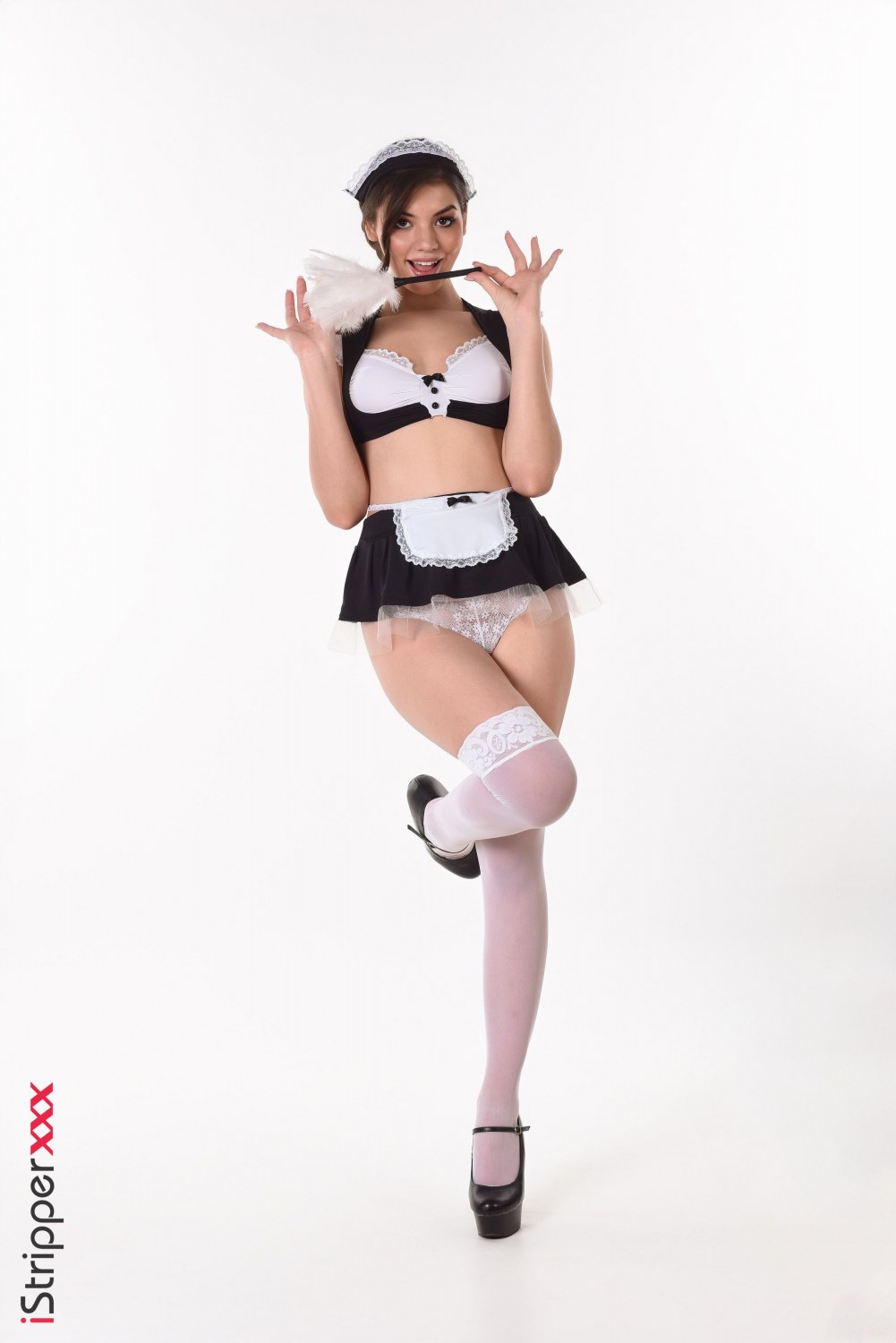 Lovely Brunette Anna Bella Teases In Maid Uniform With White Stockings And Black High Heels