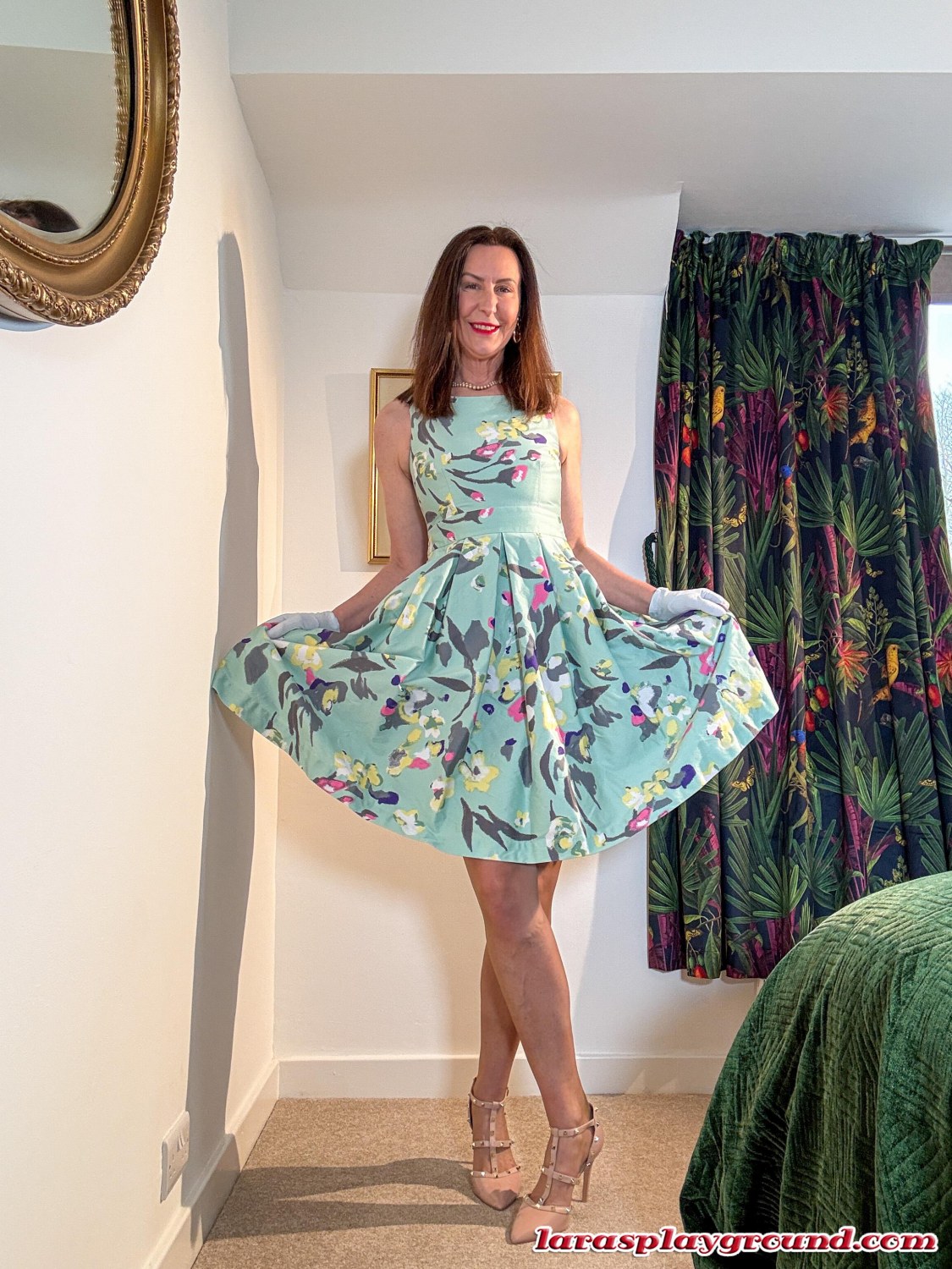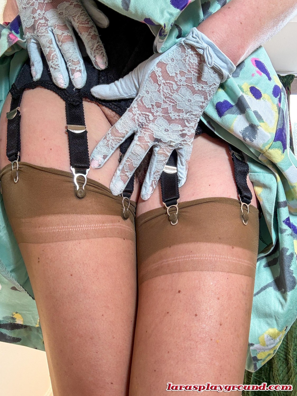British Brunette Milf Lara Teases On Bed In Her Cute Spring Dress And Tan Stockings