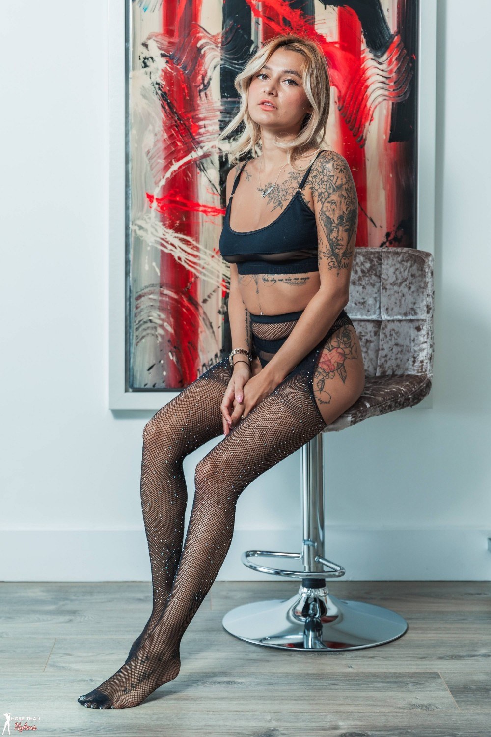 Inked Blonde Seline P Looks Amazing In Her Black Lingerie And Fishnets